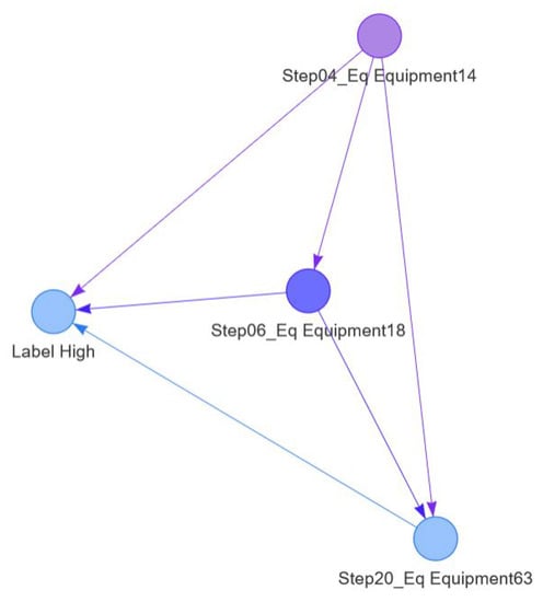 To ease the detection of root causes by practitioners, and in addition to the list, we propose a visualization that depicts tuples as nodes and overlap between them as edges between the nodes. We opted to show directed edges to represent the order in which the steps occurred. The nodes are colored according to their steps, e.g., one color is used for Step04 and another for Step06. Figure 3 is an example of the visualization on a small part of the stochastic simulation experiment (different from the previous example). The visualization tool displays all the nodes and overlaps as a grid of nodes, but these can be moved to ease the perception of clusters. Specifically, we focus on the cluster that contains the node “Label High”, which indicates a problematic product. We can see a cluster connected with the tuple Label High, which is composed of three Step–Machine tuples. The arrows indicate the order in which the steps occur (e.g., in this example, Step04_Eq occurs before Step06_Eq and Step20_Eq). Each node is colored according to its step.