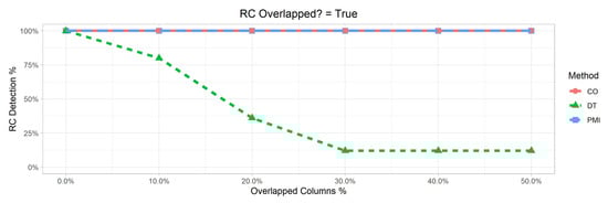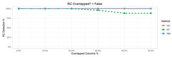 This section focuses on evaluating the effect of overlap on the performance of both factor ranking algorithms and the classifier used. A total of 250 mockup datasets were generated, and the results are presented in Figure 4 and Figure 5. The RC detection is the percentage of datasets where the root cause was correctly identified by the algorithm. The percentage of overlapped columns represents the percentage of tuples that overlapped with each other. The capacity for root-cause detection of the different factor-ranking algorithms (CO and PMI) and the classifier algorithm (DT) is evaluated in two different scenarios, i.e., one where the root cause is one of the overlapping factors, and another where it is not.