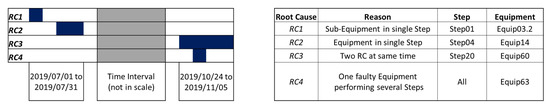 This section focuses on evaluating the performance of the proposed solution as a whole. The root causes included in the simulated data are depicted in Figure 6. Each dataset corresponds to a period of four months. On the left side of the figure, we can see the temporal distribution of the different root causes. The first two root causes are located at the beginning of the simulated period, while the last two are at the end. This concentration of root causes was (i) to mirror the imbalance between normal products (the vast majority) and problematic products (a small minority) that exist in real data, and (ii) to simulate the simultaneous occurrence of root causes, which may also occur in real datasets. The right side of the figure explains in more detail each root cause and the reason why it was used. RC1 is a failure in part of equipment or a machine. RC2 is a standard malfunction in a single machine when performing a single function (or step). RC3 is a simultaneous failure that occurs at the same time as RC4. This last root cause is a failure that happens when a machine is malfunctioning in all its functions/steps.