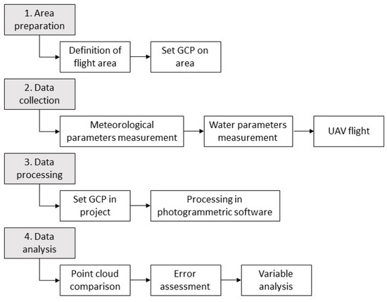 Figure 1 is a flow chart showing the methodology used. It consists of four general steps: area preparation, data collection, data processing, and data analysis.