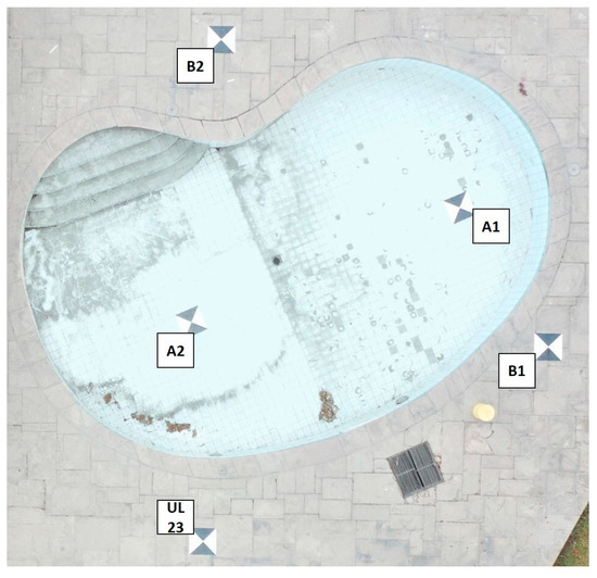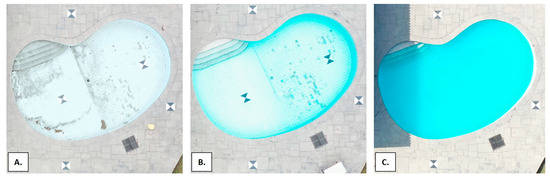 For this investigation, a 67.5 m2 swimming pool within the campus grounds of the University of Lima, located in Santiago de Surco, Lima, Peru, was set as the study area, as is shown in Figure 2. As Figure 4 shows, three types of flights were carried out: with an empty pool (flights 1 to 10), with the pool filled with clean water (flights 11 to 18), and with copper sulfate added to the pool water to simulate changes in the turbidity of the water (flights 19 to 26).