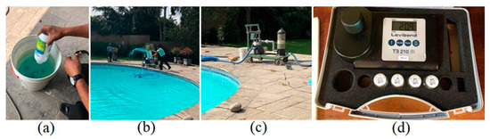 Steps for changing and measuring turbidity: (a) add a copper sulfate compound to some pool water in a container; (b) pour the mixture into the pool using an electric pump; (c) recirculate the pool water with the help of an electric pump; (d) measure the water turbidity using a turbidity meter.