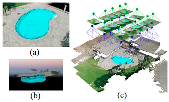 Pool image processing: (a) top view of the point cloud; (b) side view of the point cloud; (c) image processing view.