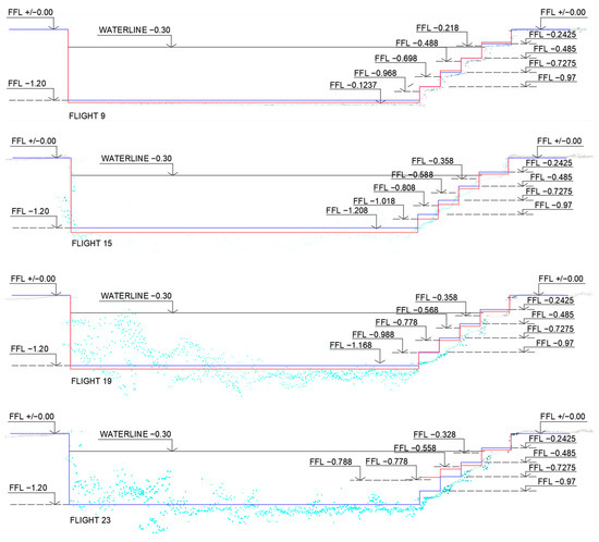 Of the 26 flights realized, those flown at a height of 30 m were chosen for the study comparison. From observing the 30 m and 50 m flights, we determined that the lower resolution of the 50 m flights affected the visualization of the data and point clouds. The point clouds obtained from the thirteen 30 m flights were compared against those of the survey conducted with conventional instruments [69]. The differences found in the finished floor levels (FFL) of the steps and the bottom of the pool were used to calculate the vertical error. Figure 8 provides four examples of point clouds, wherein the red lines represent the levels obtained using a UAV and the blue lines represent the levels obtained from conventional topographic surveys. The figure shows the distortion in the point clouds for flights 11, 15, 19, and 23. The examples correspond to flights made at a height of 30 m. The point cloud from flight 11 was obtained from a pool without water and serves as a reference of the surface without distortion.