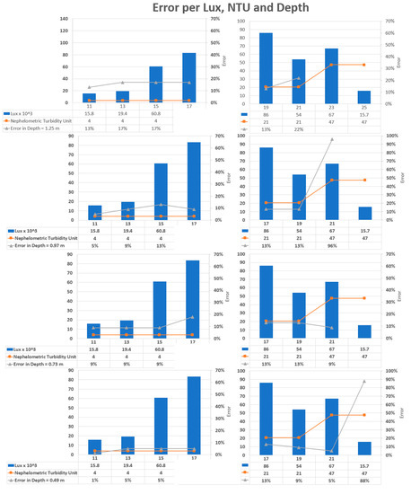 On the other hand, the results revealed that the highest luminosity generated the lowest error up to a depth of 0.97 m. In this case, two situations were observed for the turbidity variations: (1) at shallower depths (not exceeding 0.49 m), increased turbidity levels positively contributed to error reduction; and (2) at greater depths (exceeding 0.49 m), increased turbidity resulted in increased errors.