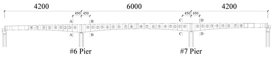 From January 2008 to February 2009, the whole super-structure of Huangsha Harbor Bridge was constructed utilizing the symmetric cantilever casting method, except the decks near the side supports. As shown in Figure 1, eight segments are cast on baskets progressively on each side of the two piers (piers #6 and #7). The same construction process is maintained for each side of the main piers, so the temporary T-shaped structures are balanced. To ensure the security and the serviceability of Huangsha Harbor Bridge, construction monitoring and control are undertaken by Southeast University (Nanjing, China) based on stress measurements at fixed ends of cantilevers (A-A, B-B, C-C, and D-D cross-sections in Figure 1).