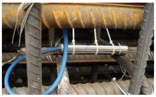 Before the concrete pouring of the 0-blocks above the piers, the vibrating wire stress transducers are attached to longitudinal reinforcing bars arranged on the top and the bottom of the cross-section of fixed ends of cantilevers for stress measurements (see Figure 3). As shown in Figure 2, four transducers are arranged on the corners of one cross-section. Shortly after important construction steps, such as the formwork erection, the concrete pouring, and the pre-stress tension for each block, the stresses are measured where transducers are arranged.