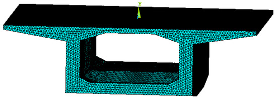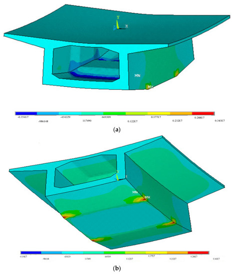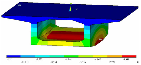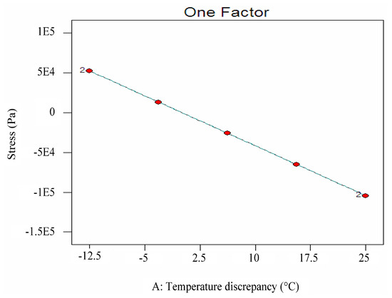 Then, a mathematical formulation to calculate the stress deviation due to the uneven temperature from the measured temperature discrepancy was established based on the FE analyses and the response surface (RS) method. More precisely, a 0-block of Huangsha Harbor Bridge is simulated numerically using 282,811 tetrahedral solid elements with 423,401 nodes on a commercial FE platform first (see Figure 4). The length of the selected 0-block is 10 m; its width is 12 m; its height is 3.5 m. Its detailed geometry is shown in Figure 1 and Figure 2. The material is C50 pure concrete, whose mass density, thermal conductivity, elastic modulus, minor Poisson’s ratio and secant coefficients of thermal expansion are 2500 kg/m3, 1.28 W/(m.K), 3.45 × 1010 Pa, 0.2 and 1 × 10−5/K, respectively. In calculating the temperature field, no boundary condition is applied; when calculating the thermal stress field, the bottom of the 0-block is fixed in all directions. Secondly, thermal stress field analysis is performed assuming the temperature changes vertically from 0 °C at the bottom of the box girder to −12.5 °C at the top of the box girder according to Ref. [17]. The calculated temperature field and the calculated longitudinal thermal stress field on the 0-block are shown in Figure 5 and Figure 6, respectively. As can be seen, the temperature changes smoothly in the vertical direction on the concrete structure in Figure 5. According to Figure 6, the maximum longitudinal thermal stress (3.43 MPa) is found at the bottom of the box girder, which is greater than the tensile strength of C50 concrete (2.65 MPa). This indicates that the stress induced by the uneven temperature is significant for Huangsha Harbor Bridge under construction. Multiple thermal stress field analyses are undertaken based on one-factor design and the temperature variation range stipulated in Ref. [17], and the stress at the position of the realistic upper measurement point is extracted for each case, which is listed in Table 1. Then, using data listed in Table 1, a linear regression model (Equation (1)) describing the relationship between the temperature discrepancy (in °C) and the induced stress at upper measurement point (in Pa) is established for use according to the RS method. The significant test results for the established regression model are shown in Table 2. Table 2 has three important results to show that Equation (1) is valid: (1) F = 1.780× 108 > F0.05, p < 0.0001. This shows that the regression model is significant, and the lack of fit term is insignificant. (2) R2 = 1. This proves that the model is accurate, and the experimental error is small. (3) Adequate precision equals 23,532.462. This proves that the signal is sufficient and the fitting cure is valid over the entire design space. Further, the temperature discrepancy against the calculated stress curve is plotted in Figure 7 to further show the rationality of Equation (1). From Figure 7, a linear relationship exists between the temperature discrepancy and the stress.