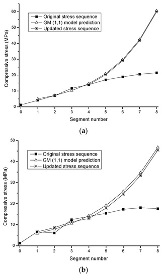 Stress sequences measured on location and predicted by GM (1,1) models. (a) B-B cross-section. (b) C-C cross-section.