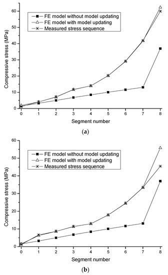 In this portion of study, the numerical model established in Section 4 is updated using the updated stress sequences measured on B-B and C-C cross-sections presented in Figure 8. The FE model for the stages where the pre-stresses are applied to the constructed segments 1–7 is updated, in turn, by treating the applied pre-stresses as the uncertain parameters to identify.