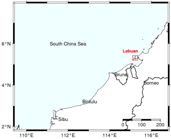 A locational map of Labuan Island in relation to the South China Sea and Borneo.