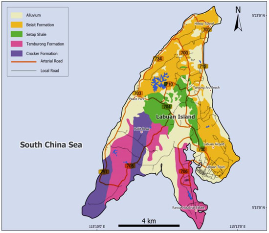 Labuan geological map, showing the distribution of the four major formations on the island [18].
