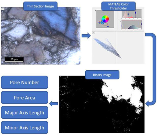 Image analysis workflow diagram for identifying pore spaces in thin sections. The first step is identifying pore spaces based on the color difference using thin sections, the second step is to separate the blue color, the third step is to create a binary images with the 0 value for pore spaces and the 1 value for minerals, and the last step was to classify the clusters of the 0 value spots to calculate their areas, and axes lengths.