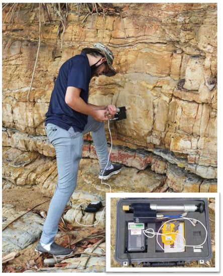A portable air permeability meter (Figure 6) was used in this study to provide fast, in situ permeability measurements using a Tinyperm II manufactured by (New England Research, Inc. White River Junction, VT, USA), which measures the permeability of rocks by injecting air through part of the rock surface area and calculating the time taken for the pressure created to be released. Accessible spots at each outcrop along each formation were selected to provide several representative points for the Belait and Temburong Formations. The permeameter detected the permeability within the 1 to 1000 mD range [20]. An average of the multiple readings was taken from the interval to obtain a representative result, and then the measurements were converted into millidarcy using (Equation (5)) [18].