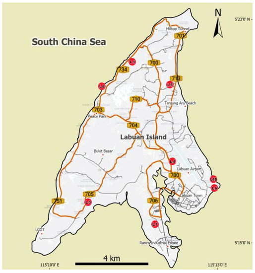 The locations of the studied exposed outcrops on Labuan Island (red dots).