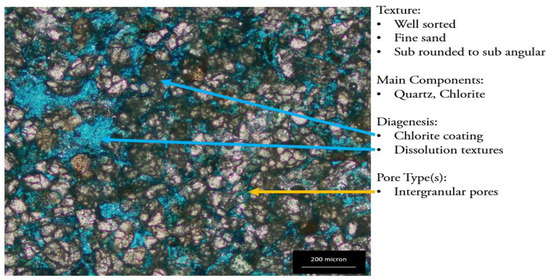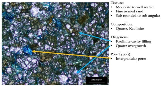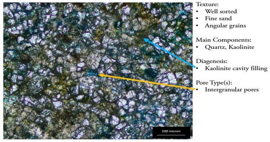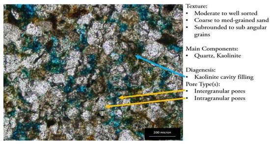 Some thin sections of the Belait and Temburong Formations from the L1, L3, L5, L6, and L8 outcrops were prepared and observed under a polarized microscope to identify the different petrographical parameters, such as the texture, facies, diagenesis, visual porosity, estimation, and pore size distribution analysis (Figure 10, Figure 11, Figure 12, Figure 13, Figure 14, Figure 15, Figure 16 and Figure 17). The identification of the different sedimentology and mineralogy features is based on their optical properties. The clay types were later identified based on the Th/K ratio. The samples have shown various sedimentological and diagenetic features, including tight argillaceous features, moderately sorted sandstone with kaolinite filling textures, quartz overgrowth, illite pore-lining, and chlorite grain coating. The diagenetic features were studied from three thin sections, representing the three main facies. The thin sections were explicitly studied to identify the authigenic clay minerals. L1-01 represents the fine facies of the Belait Formation, L3-01 represents the Temburong tight sandstone facies, and L5-01 shows the coarse sandstone facies of the Belait Formation, depicted in Figure 15, Figure 16 and Figure 17, respectively. The different morphologies of authigenic clay minerals were identified under a microscope, including kaolinite cavity filling, illite pore lining, and chlorite grain coating. Sample L1-01, which is dominated by kaolinite and has a poor permeability, shows kaolinite pore filling domination under a microscope (Figure 12). Sample L3-01, which is characterized by the domination of mixed-layer clay and has a poor permeability, shows pore-filling kaolinite, quartz cement, quartz overgrowth, and illite pore lining clearly, as shown in Figure 13. Sample L5-01, which represents chlorite domination and has good permeability values, shows a high percentage of chlorite coats and a small amount of kaolinite filling, with clear pore spaces in the thin section (Figure 14).