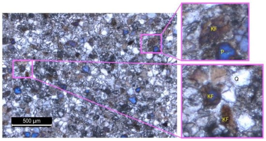 Textural and compositional features of L1-01. (Q) Quartz, (P) pore space, and (KF) kaolinite filling.