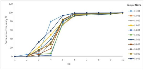 In contrast, the Temburong Formation’s samples show a tight porosity range with a higher microporosity percentage. The outliers reached more than 30 points in some of the samples presented above, which may not be a considerable number, as the total pores identified exceeded 750 pores per image. Hence, the outliers, especially in L301, L302, and L303, are less than 5% (Figure 20). The analysis of the different grain sizes in Table 3 in the results section shows the domination of a very fine sand size in most of the samples. Based on the percentages of sand, silt, and clay, the USDA classification revealed that all of the analyzed samples are classified as sand or loamy sands (Figure 21). None of the analyzed samples showed any presence of any grain size greater than a medium sand size (Figure 22). The clay size ranged between 0.36 to 2.72 percent of the total weight. The grain size cumulative frequency curves of the studied samples are presented.