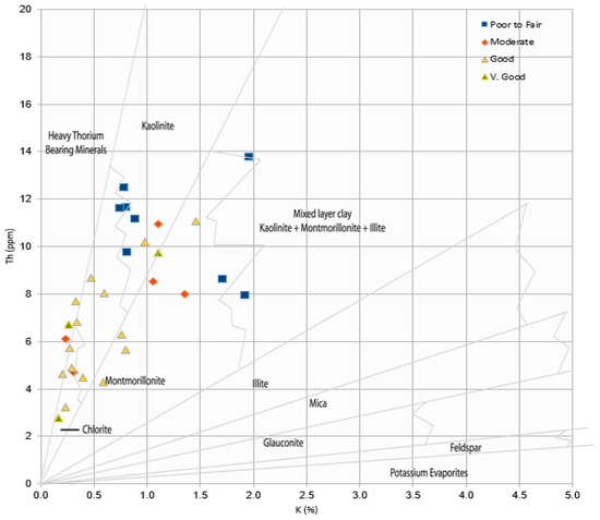 Thorium/potassium cross-plot showing the different classes of permeability and clay minerals type associated with them (modified after [24]).