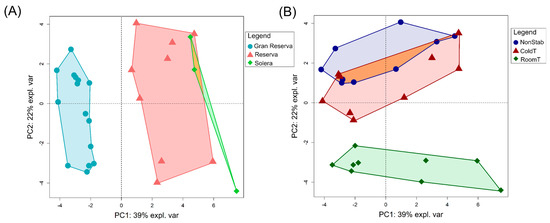 Principal component analysis (PCA) carried out on the brandy samples. Scores plot for the first two principal component highlighting brandies according to the ageing factor (A), and before and after cold stabilization and filtration treatment (B). NonStab: non-stabilized brandy; ColdT: brandy stabilized at cold temperature; RoomT: brandy stabilized at room temperature.