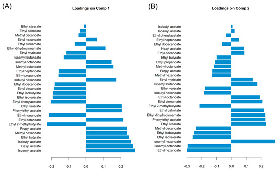 Loadings bar plot on component 1 (A) and component 2 (B) of the principal component analysis carried out on the brandy samples.
