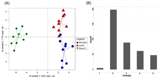 Graphical outputs of the multilevel partial least squares discriminant analysis (ML-PLS-DA) carried out to discriminate between the brandy samples before and after cold stabilization and filtration. (A) Scores plot for component 1 (X-variate 1) and component 2 (X-variate 2), and (B) histogram of the number of components optimized for the sub-models during the double-cross validation. NonStab: non-stabilized brandies; ColdT: brandy stabilized at cold temperature; RoomT: brandy stabilized at room temperature.