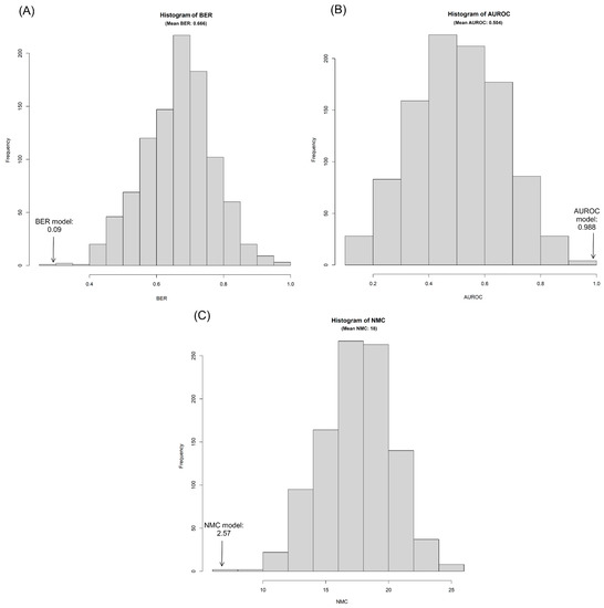 Results from the permutation test (n = 1000) performed on the multilevel partial least squares discriminant analysis (ML-PLS-DA). Histogram obtained from the permutation test for (A) the balanced error rate (BER), (B) area under the receiver operating characteristic curve (AUROC), and (C) the average number of misclassified (NMC). The real average performance of the model for the three statistics obtained from the double cross-validation is shown in each plot.