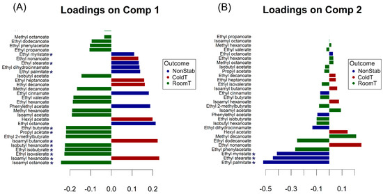 Loadings contribution barplot on component 1 (A) and component 2 (B) of the multilevel partial least squares discriminant analysis (ML-PLS-DA) carried out to discriminate between brandy samples before and after cold stabilization and filtration. Color indicates the class for which the compound had a maximal mean value. Bar length represents the multivariate regression coefficient, with either a positive or negative sign for that particular feature of each component, i.e., the importance of each variable in the model. NonStab: non-stabilized brandies; ColdT: brandy stabilized at cold temperature; RoomT: brandy stabilized at room temperature. An asterisk highlights the most discriminative compounds selected during a variable reduction procedure (i.e., potential markers related with the stabilization method).