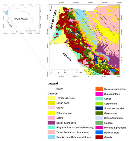 The study area covered the whole of the Midyan Terrane in the northernmost part of Saudi Arabia (Figure 1). It extends from the Duba area at the southern part to the extreme northern part of the Al Bad’ area. The area is exposed to a huge series of hard rocks, mainly meta-luminous, alkali, peralkaline granitic, and granodiorite rocks, and constitutes the north-western part of the Arabian–Nubian Shield, formed by the accretion of island arc terrain between 850 and 500 Ma [31,32]. These series are aligned along a northwest–southeast direction following the main trend of the Red Sea rift. The peralkaline granites (Midyan) constitute the last granitic phase of the Pan-African thermal event and the development of the Arabian Shield [33,34,35]. The area of interest also comprises sediments and rocks ranging in age from Quaternary to Precambrian. The Late Cretaceous to Tertiary deposits that exist in the study area are also well-exposed at the Midyan Peninsula, which fell within the study area [36].