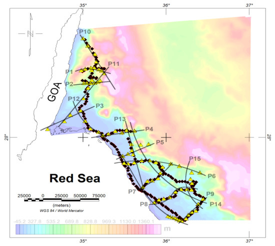 - Tubbs, R.E., Jr.; Fouda, G.A.H.; Afifi, A.M.; Raterman, N.S.; Hughes, G.W.; Fadolalkarem, Y.K. Midyan Peninsula, northern Red Sea, Saudi Arabia: Seismic imaging and regional interpretation. GeoArabia 2014, 19, 165–184. [Google Scholar] [CrossRef]