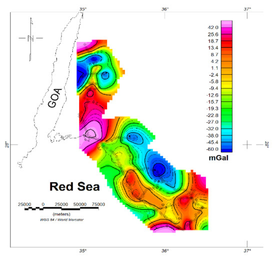 The gravity data were processed by applying the most common corrections (e.g., tidal, instrument drift, latitude, free air, and Bouguer corrections). After removing the regional trend [43,44] from within the gravity data, the residual Bouguer anomaly map was displayed (Figure 3). It showed that the average anomaly values ranged from −60 to 42 mGal. Low- and high-gravity anomalies matched well with the surface geology.