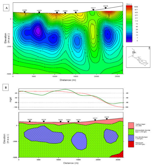 The geophysical resistivity method is one of the methods that can be used to explore and investigate geothermal resources. It provides information about the rock properties (e.g., porosity and permeability) and the degree of hydrothermal alteration, which can be used to determine the geometry and depths of geothermal reservoirs and to locate the fracture zones by means of resistivity contrasts [15,16]. The electrical resistivity of geothermal reservoir rocks is associated with porosity, water, and the exchange capacity, and is strongly controlled by temperature. Therefore, exploring low-resistivity areas by geophysical methods based upon electric resistivities plays a significant role in identifying high-temperature zones related to geothermal reservoirs [11,17].