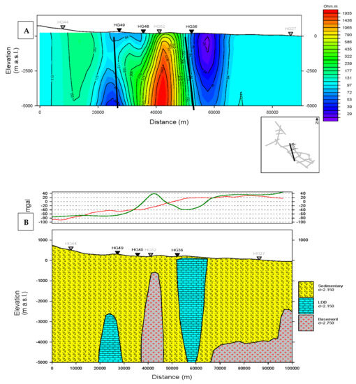 Profile-4 cross-sections derived from (A) 2D modeling of AMT data (upper panel) and (B) density modelling (lower panel).