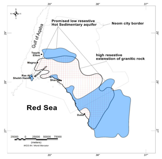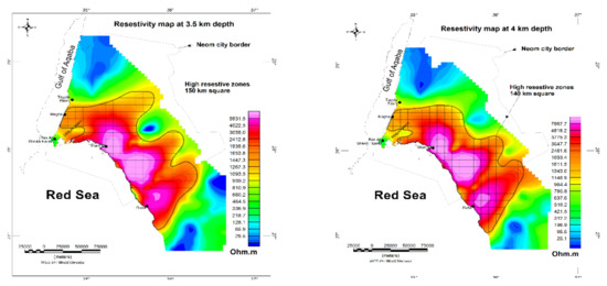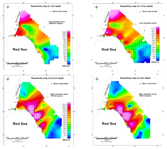 Two important areas were deduced from the data analysis; i.e., areas with low resistive values (e.g., the blue polygons in Figure 8) and areas of high resistive values (the red crossed lines in Figure 8). Areas with low resistivity were considered to be hot sedimentary aquifers whereas areas with high resistive values represented the extension of high-heat granitic rocks.