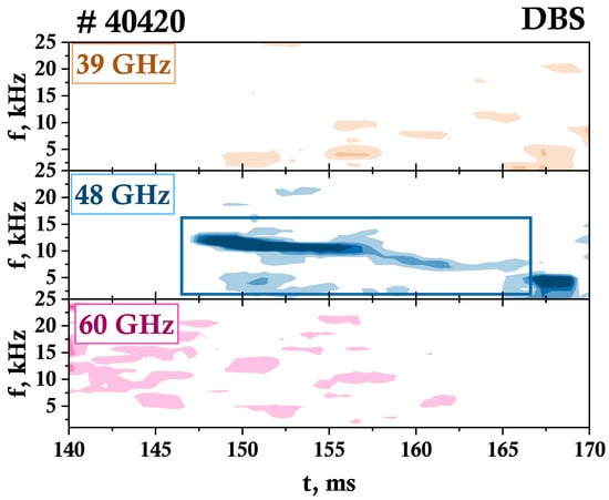 Figure 3 where the spectrograms of the DBS phase derivative signals for three neighboring channels with probing frequencies 39, 48, 60 GHz are presented. This highlights that the TM is only observable on the 48 GHz channel and cannot be observed on the other 20, 29, 39, 48, 60 GHz channels. It is found in the spectrogram at 148–165 ms during the same time as the fluctuations on the magnetic probe signal in