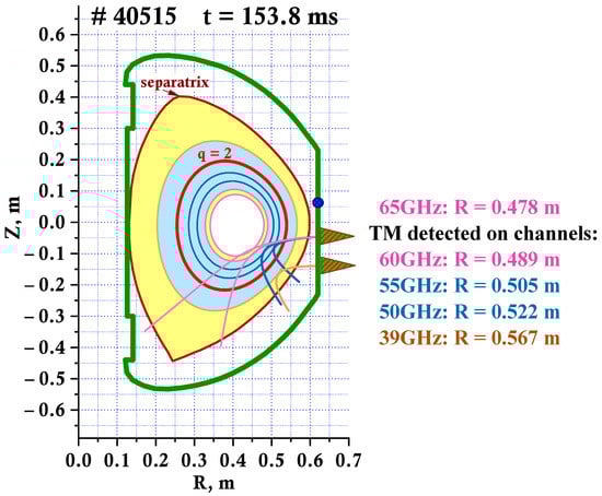 As the TM was found on several DBS channels, it has been dubbed the wide tearing mode. We may assume that the island width is limited by the cut-off positions of the 65 and 39 GHz frequencies. Using the cut-off radii values we can estimate the island width to be 8–10 cm.