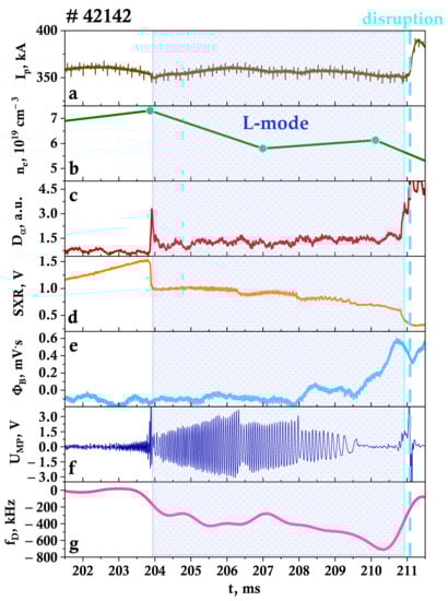Figure 8g in the form of the measured Doppler frequency shift of the 39 GHz channel. In discharge #42142 a disruption occurs at 211 ms. The scenario of a disruption after MHD activity is a studied phenomenon [