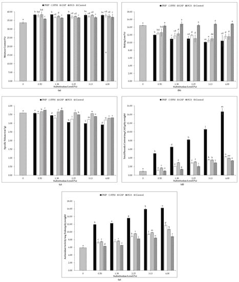 The textural properties (hardness, springiness, cohesiveness, chewiness, and resilience) of the breads are shown in Figure 3; these are important quality factors because these properties are strongly related to consumer preferences. Hardness is defined as the loss of softness of the bread crumb and is measured in newtons (N) [35]. The hardness of the control bread was 32.8 N, indicating a firm and dense texture. The highest crumb hardness was found for the bread with the 4.0% addition of FGS (39.65 N), and the lowest was found for the bread with the 0.5% addition of FPH (26.37 N). As can be seen in Figure 3a, PHP and FPH showed softening effects on the crumb hardness, whereas FGS and bread with a higher level of 2.25% GSP had significantly equal and higher hardness values than the control bread. When the level of additives was increased from 0.5% to 4%, the hardness of the enriched bread crumbs (with the exception of FGS) initially decreased and then increased, and the hardness of the PHP and FPH breads to which 4% was added were similar to that of the control (Figure 3a). The hardness of the breads with GSP and FGS additions were higher than those of the breads with PHP and FPH additions. This result can be explained by the higher moisture contents of the breads with PHP and FPH (Figure 1a), the additions of dietary fiber (according to Akbari-Alavijeh et al. [17], pistachio hulls are a source of dietary fiber), and the increase in protein content (Table 1) decreasing the hardness [36,37,38,39]. In addition, the results of the ANOVA showed that the type and level of additives had significant effects on the hardness, and it was clear that the hardness in all enriched breads increased with increased levels of additives (Figure 3a). Similarly, Chen et al. [6], Korus et al. [40], and Dziki et al. [29] found that bread crumb hardness increased with increasing amounts of additives via fortification with mango peel powder, lyophilized kale, and parsley leaf powder, respectively.
