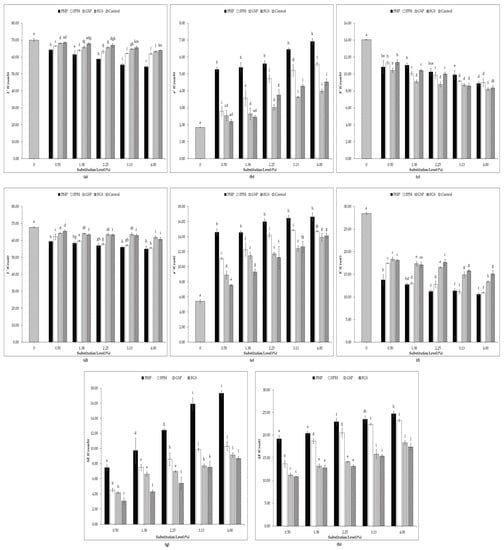 Crumb L* (a), crumb a* (b), crumb b* (c), crust L* (d), crust a* (e), crust b* (f), crumb color change (g), and crust color change (h) of the control and enriched breads. Values of each parameter with the same letters were not significantly different (p > 0.05).
