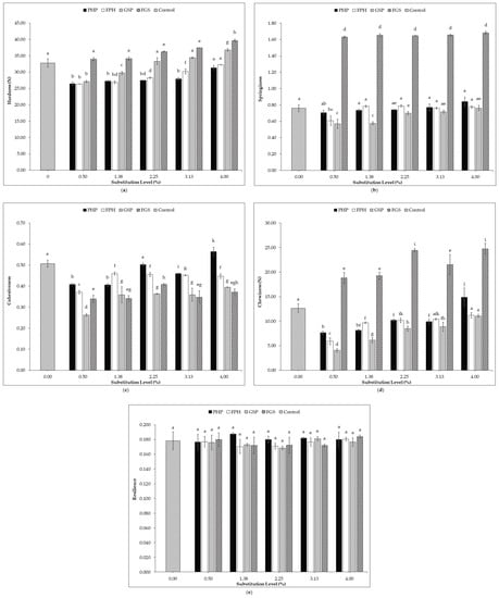 Hardness (a), springiness (b), cohesiveness (c), chewiness (d), and resilience (e) of the control and enriched breads. Values of each parameter with the same letters were not significantly different (p > 0.05).