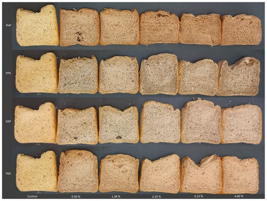 The total color differences (ΔE) of the crumbs ranged from 7.45 to 17.31% for PHP, 4.52 to 10.29% for FPH, 4.16 to 9.13% for GSP, and 3.05 to 17.31% for FGS. This parameter (ΔE) indicated significant changes in color after the fortification compared with the control. As the amount of additive in the bread dough increased, the ΔE of the crumb increased (Figure 2g). The ΔE values of the crust also decreased with increasing additive levels (Figure 2h). In addition, the highest values for crumb and crust color changes were obtained for bread with PHP, while the lowest values were obtained for bread with FGS. The type of additive used had a significant effect on the color of the breads. The results from the ANOVA also clearly demonstrated that the ΔE values of the crumb and crust changed significantly depending on the type and level of additive (Figure 2g,h).