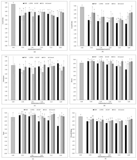 Results of the sensory analysis of the control and enriched breads. Crust color (a), crumb color (b), chewiness (c), flavor (d), taste (e), and overall liking (f). Values of each parameter with the same letters were not significantly different (p > 0.05).