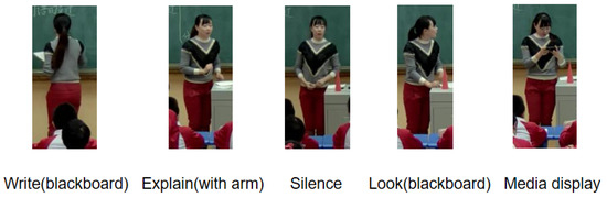 As teachers’ behavior is closely related to verbal information, when image information is used alone for discrimination, there will be many ambiguous judgments. For example, we can not describe a teacher’s “Explanation behavior” with actions. To improve this problem, this paper adopts a hierarchical recognition method of posture–action behavior. We recognize teachers’ actions by their local postures instead of directly recognizing their behaviors because gestures and actions have a unique correspondence, while actions and behaviors have a “many-to-many” relationship. The recognition of teachers’ behaviors can be achieved by combining action recognition and situational reasoning.