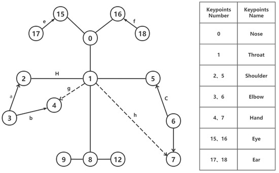 24] as a tool. Human skeleton information refers to the coordinate information of human joints, which is concise, so it is often used in human behavior recognition. Similarly, because there is less information when it is missing, it will have a greater impact on the recognition effect. Therefore, considering the serious occlusion between students, the small target in the back row, and the serious lack of skeletal information, this paper only designs the skeletal features of teachers’ behavior. A human body skeleton diagram is shown in
