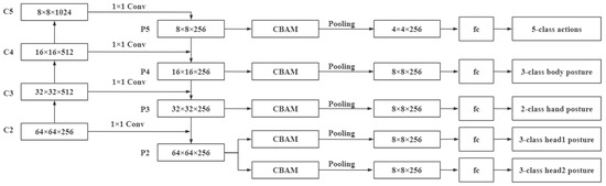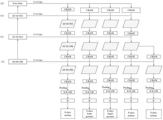 Figure 6, which realizes bottom-up feature extraction and top-down feature fusion. Four pipelines are designed, and CBAM is added between every two levels to enhance feature expression, which can fuse all important information from high level to low level for each local gesture and action, and each pipeline is relatively independent. In the network’s output, the features of the action pipeline will fuse the features of the other four local gestures to provide as effective information as possible for the action recognition. This design embodies the idea that the local gestures will affect the action representation in this study;