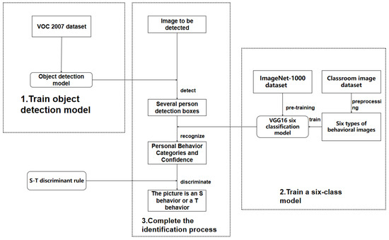 Figure 7 is the flow chart of the S–T behavior recognition experiment in this paper. This experiment process is mainly divided into three steps. The first and second steps are the training of an object detection model and classification model, and the third step is the image detection and judgment by using detection and classification model and S–T behavior discrimination rules.