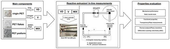 where ∆Hm is the measured melting enthalpy, ∆Hcc is the measured enthalpy of cold crystallization, and ΔH100 is the theoretical melting enthalpy, φ refers to the filler/additive content. The melting enthalpy for the 100% crystalline PET phase was taken from the previous literature [34,35,36]. The research methodology of the presented study is shown in Figure 2.