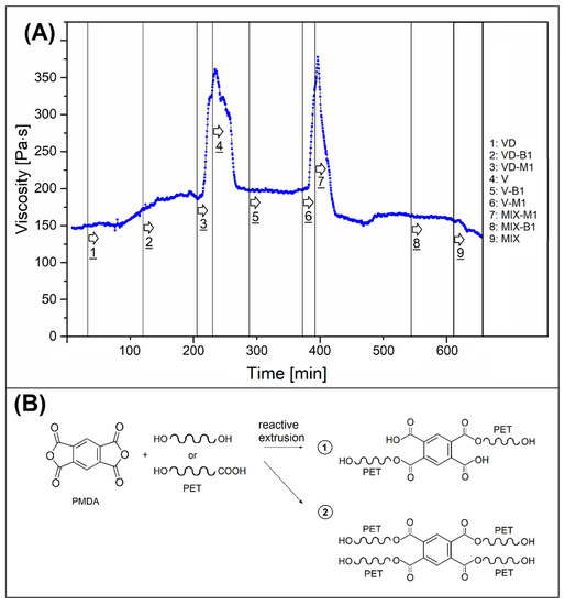 (A) The results of the in-line viscosity measurements conducted during the production of the PET foil. (B) Possible course of the reaction in compositions containing the addition of the modifier M1 (PMDA) to PET resin.