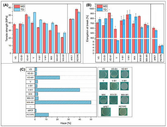 The results of the mechanical tests are shown in Figure 4, where the charts present the values of the tensile strength (Figure 4A) and elongation at break (Figure 4B). The results include measurements performed in the machine direction (MD) and transverse direction (TD). In addition to samples prepared as part of the conducted experiment, the results also include measurements for reference materials, where APET (amorphous polyethylene terephthalate) refers to monolayer PET film, while PET/PE was prepared with an additional laminated polyethylene (PE) layer. Further, Figure 4C shows the results of haze factor measurements and the appearance of foil samples.