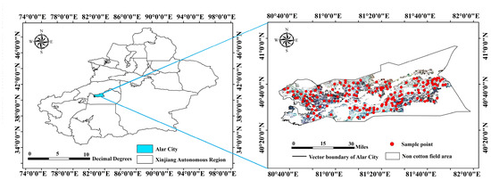 The Alar Reclamation Area is located in the transition zone between the Taklamakan Desert and the Tianshan Mountains, as shown in Figure 1. It is a county-level city directly under the jurisdiction of the Xinjiang Uygur Autonomous Region (80°30′~81°58′ E, 40°22′~40°57′ N). It is warm, temperate, and continental and has an arid desert climate and a very fragile ecological environment. It is adjacent to the Tarim River, with a total area of 4197.58 km2. There are nine regiments in the reclamation area (Numbers 7 to 16 are regiments, while Number 15 is withdrawn) and three major reservoirs, including the Shengli reservoir. The average annual evaporation, average annual precipitation, and average annual temperature are approximately 1876.6~2558.9 mm, 40.1~82.5 mm, and 10.7 °C, respectively [11]. Its evaporation is far greater than the precipitation. The wild woody plants in the Alar Reclamation Area are dominated by Populus euphratica and Tamarix, and the main economic crops include cotton, wheat, apples, fragrant pears, walnuts, etc. Among them, cotton is the largest planting area and the most widely distributed area.